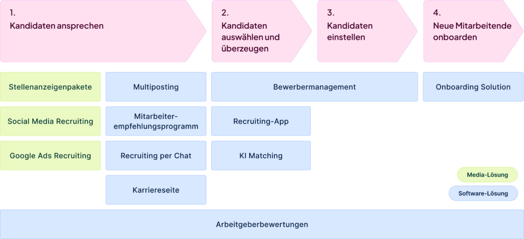 Unsere Lösungen unterstützen den klassischen Recruiting-Prozess: Bewerber ansprechen, überzeugen & einstellen und schließlich onboarden. Entlang dieses Prozesses bieten wir dir verschiedene Software-Lösungen und Dienstleistungen, die nahtlos integriert sind.