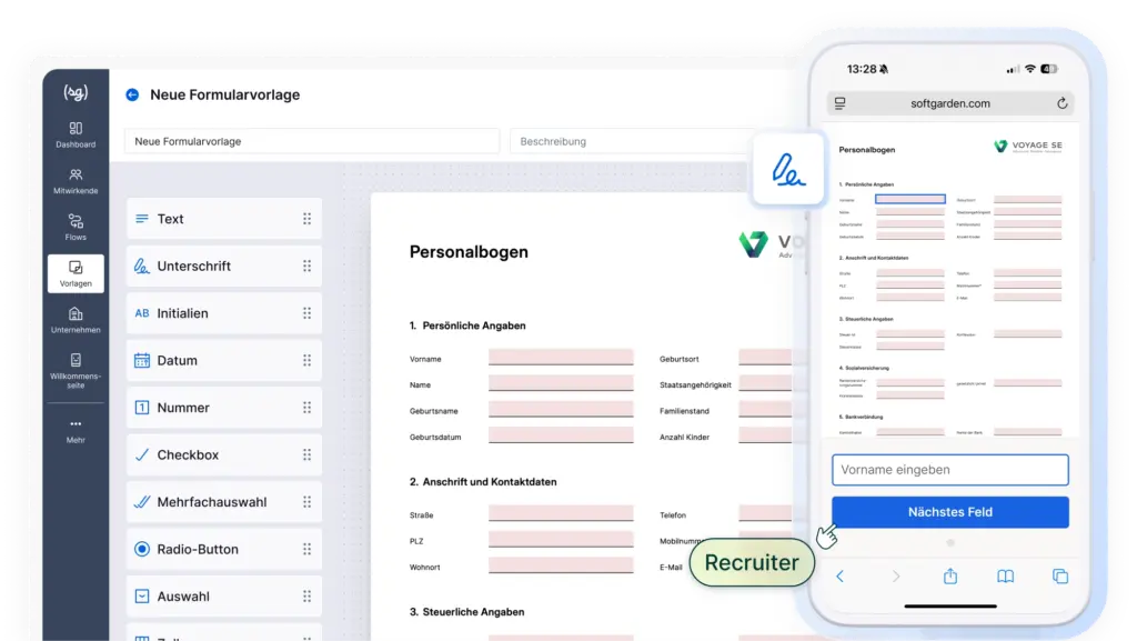 Onboarding can be initiated directly from the softgarden applicant management system. All relevant applicant data is automatically transferred to the onboarding solution – for a seamless transition from recruiting to onboarding.