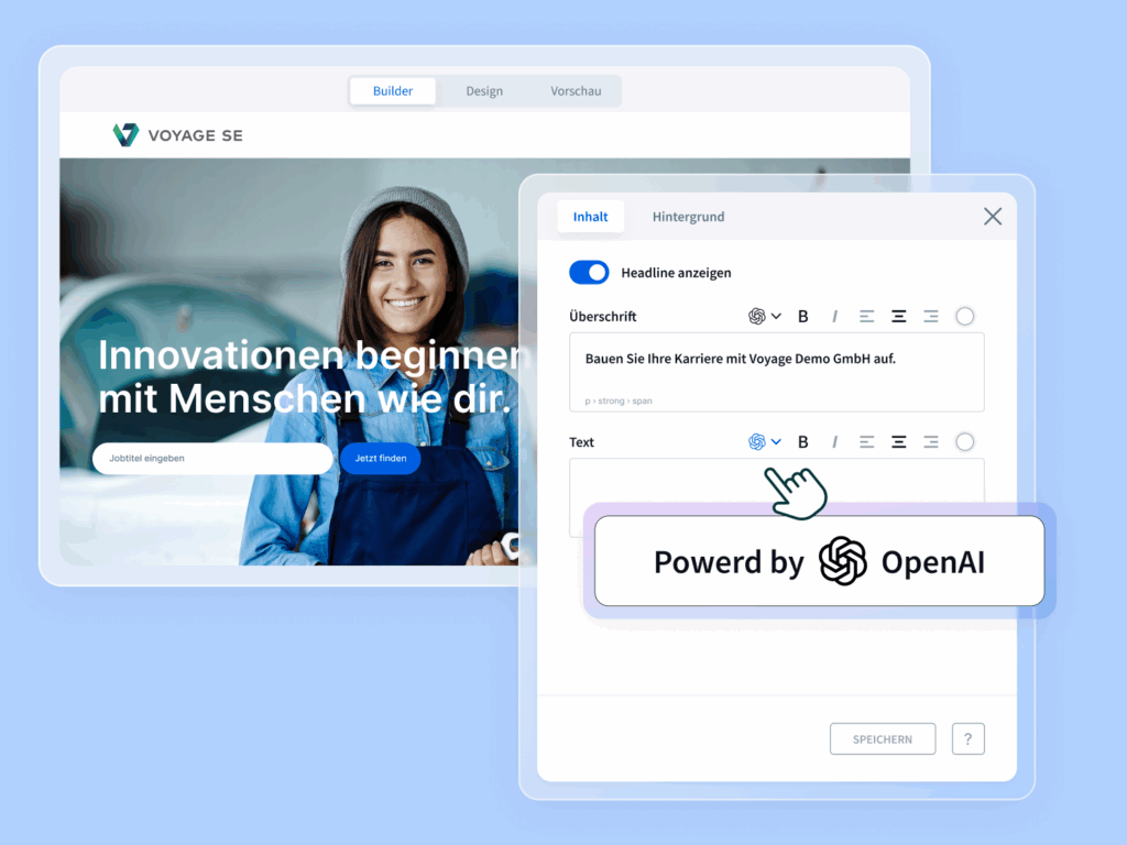 The AI-assisted creation and optimization of texts for job postings and career pages is based on the use of OpenAI ChatGPT. Since no personal data is collected or processed — unless entered by the recruiter — its use is fully GDPR-compliant.